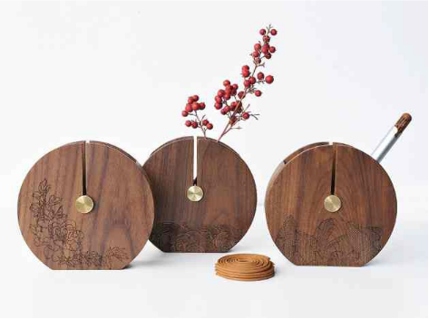 ,在功能上創造性的提出了盤香豎立焚 燒的構想,讓煙霧更唯美,存積香灰更 方便。巧妙而精致的黃銅香架除了掛香 功能外,和黑胡桃圓形香爐一起構成了 一副圓月升空的東方美學景致。激光雕 刻的多主題定制圖案如芭蕉,江濤,繁 花等更形象的傳遞了東方意蘊。