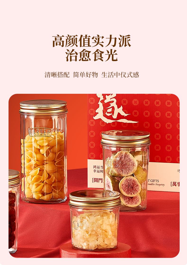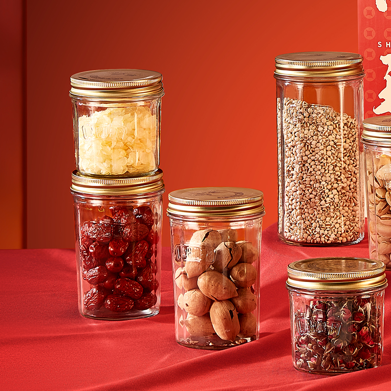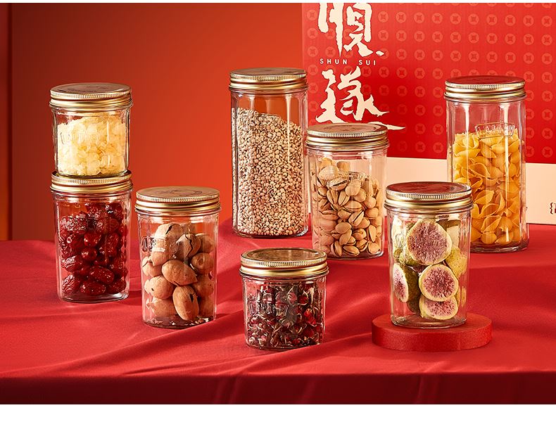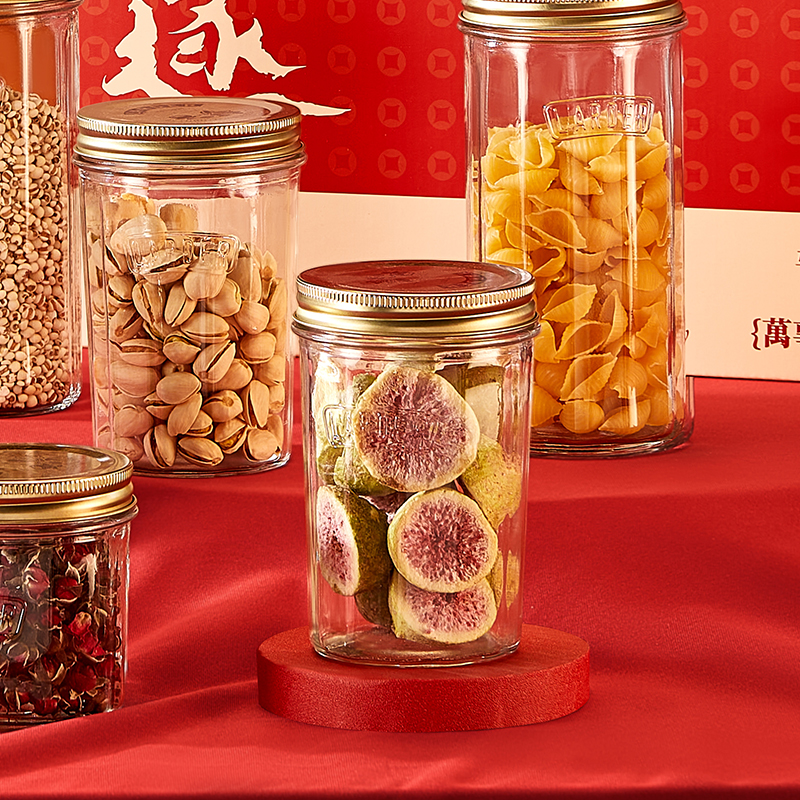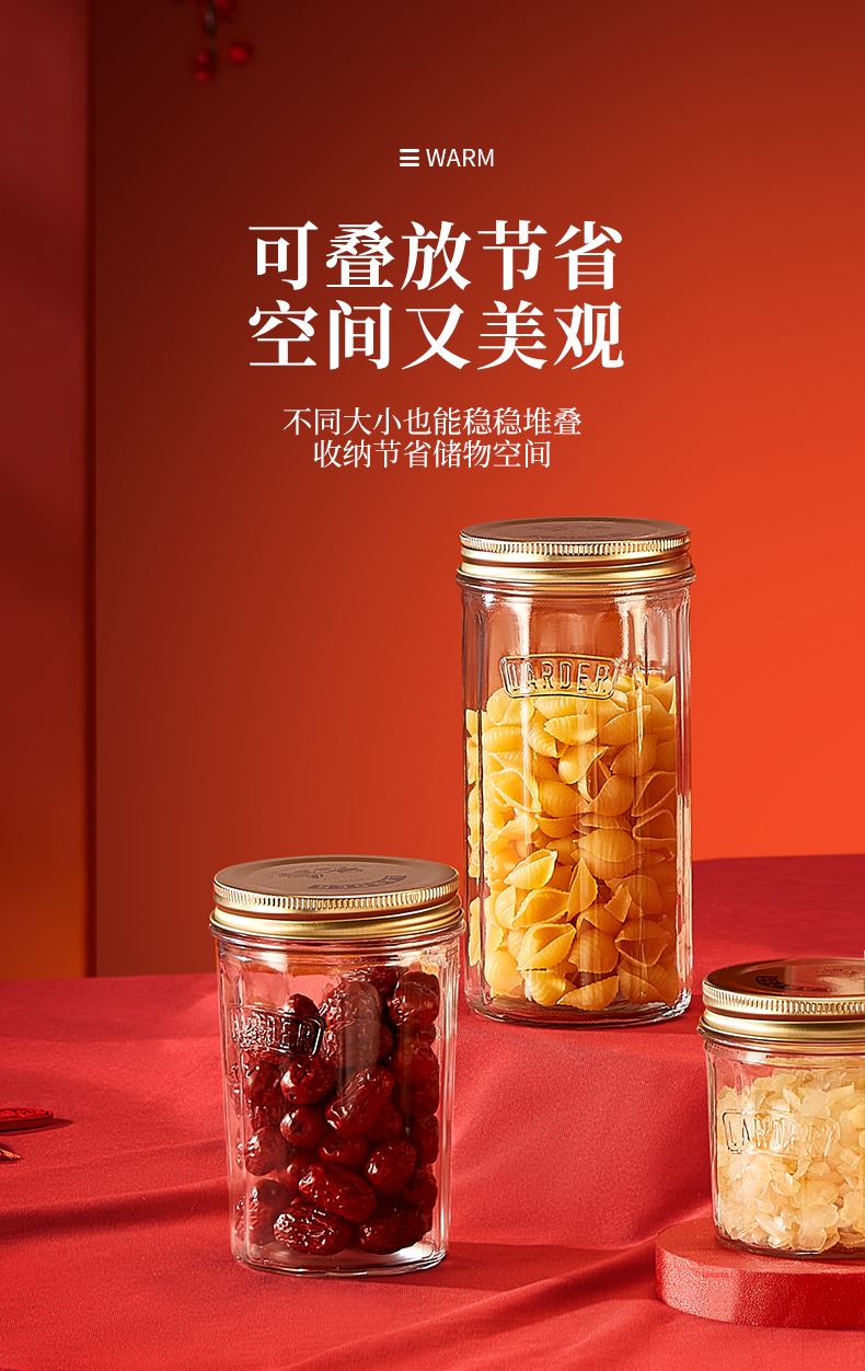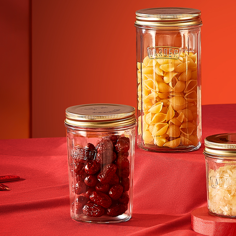 1.采用高透光無鉛玻璃瓶身,無毒無異味,可直接接觸食材,符合健康飲食需求,透明質地清晰展示內容物狀態。?2.復古工業美學設計復刻1927年經典工業風,古銅色馬口鐵螺紋防滑蓋+棱紋金屬質感,搭配疊落式結構。?3.三容量選擇,滿足廚房儲物、吧臺調酒、辦公收納等需求;可疊放設計節省空間,成組擺放提升空間格調。