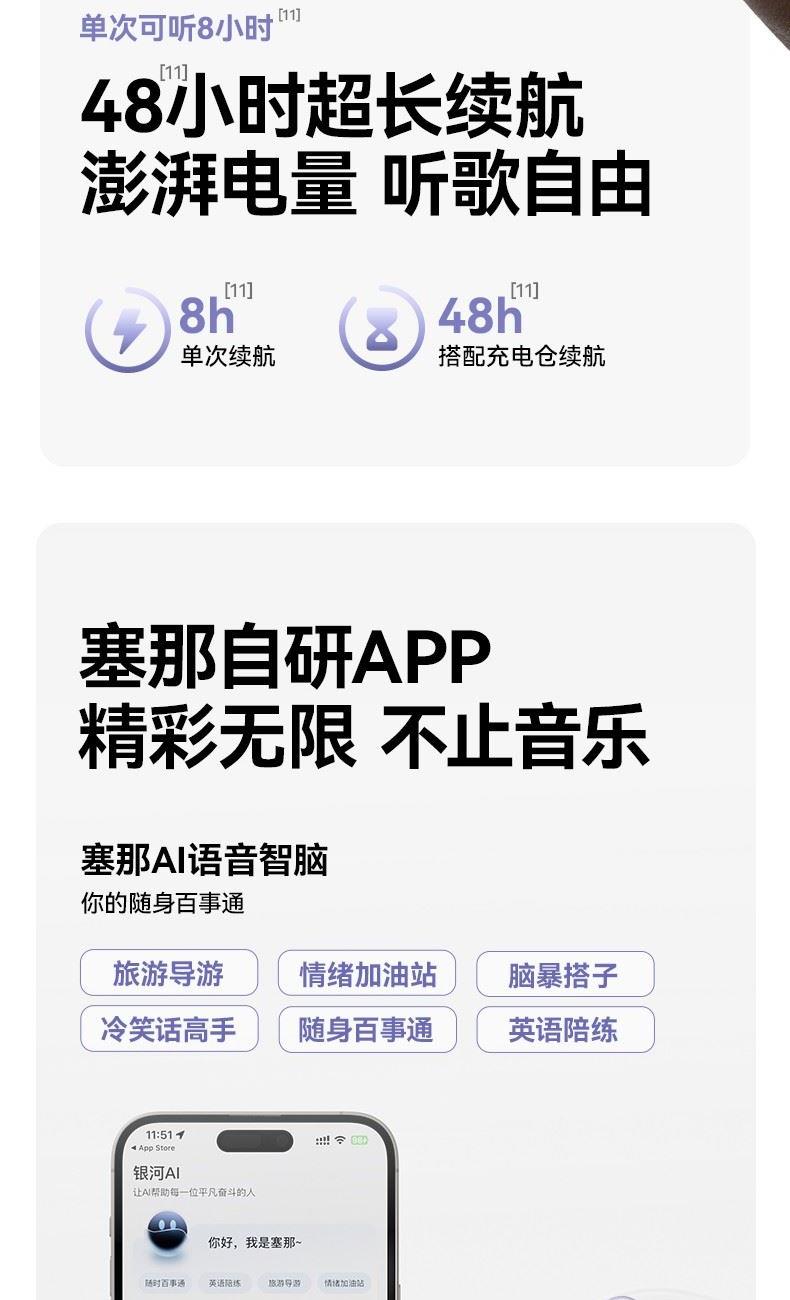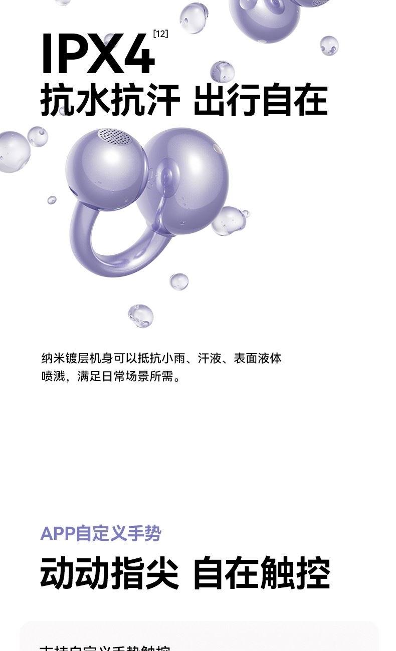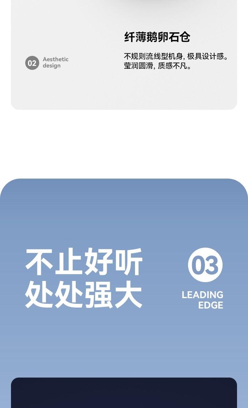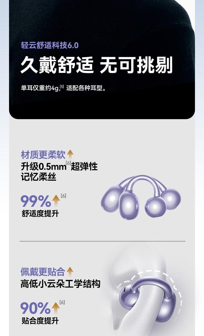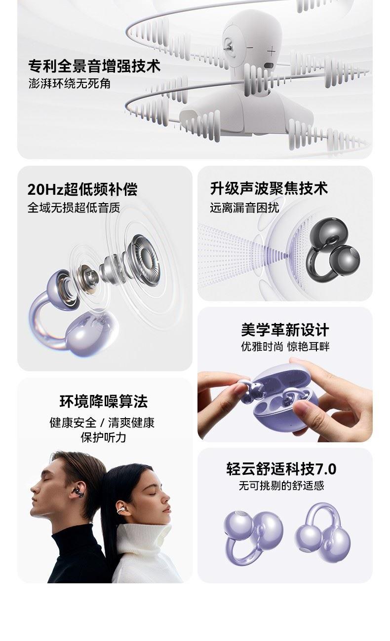 "1、”星女郎“林允同款,時尚設計鵝卵石倉,腔體線條優化,極簡不凡,質感不凡; 2、單耳僅重約4g,耳橋增長變軟,柔軟性增加,久戴舒適,無可挑剔; 3、重塑空間聲場,12重聲景定位,全景音增強,更臨境、更真實、更澎湃; 4、多種AI應用,多種EQ調音,耳機定位查找; "