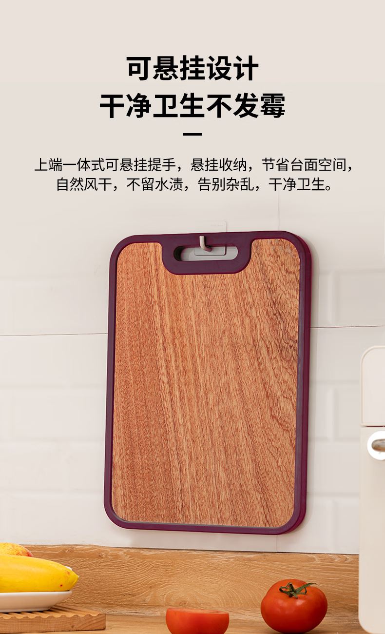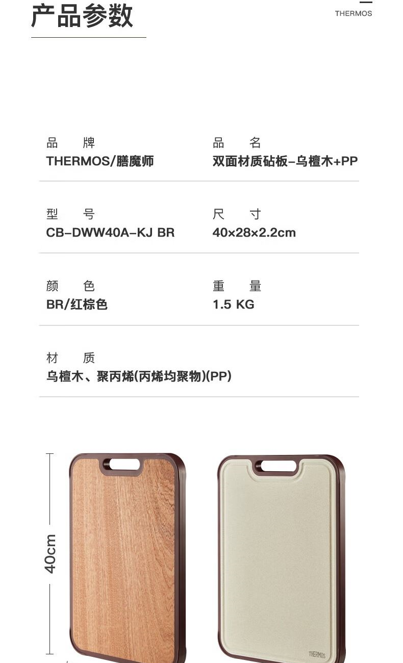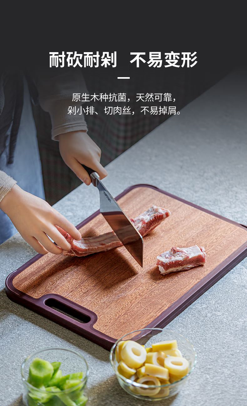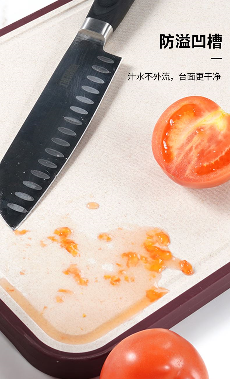 產品材質:烏檀木+小麥秸稈PP 尺 寸: 40*28*2cm 裝 箱 數 : 6個/箱 毛 重 : 1.5kg 盒 尺 寸 : 400*280*20mm 條 形 碼:6926497308167 功能賣點: 1、原生進口烏檀木,耐砍耐剁更防霉 2、谷纖維面不傷刀不開裂 3、雙面設計,生熟分開更健康 4、防溢凹槽設計,汁水不外流,臺面更干靜 5、一體式可懸掛提手,告別雜亂,節省臺面空間