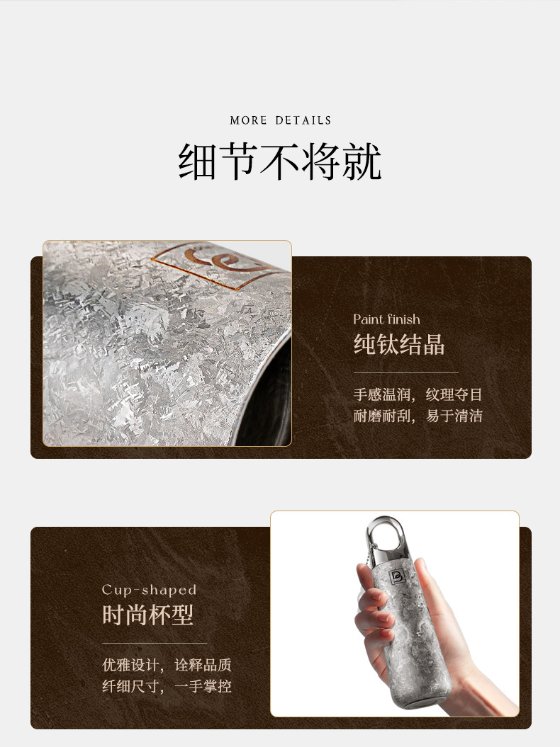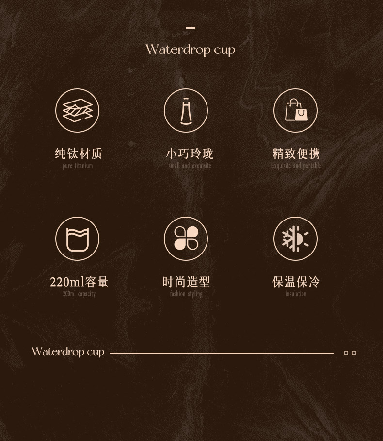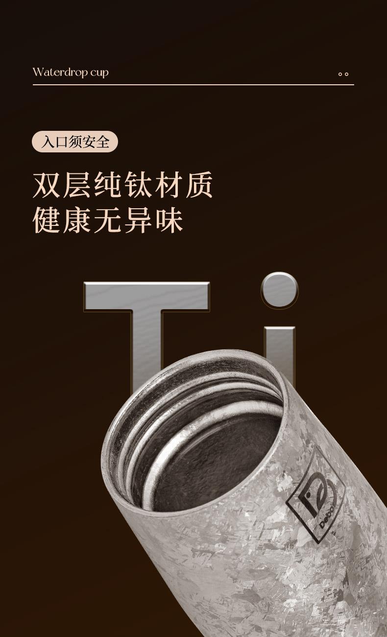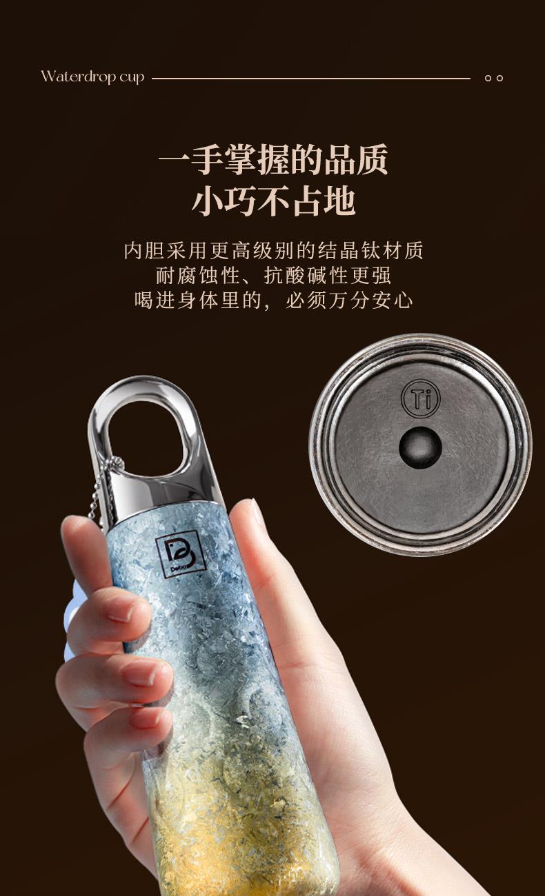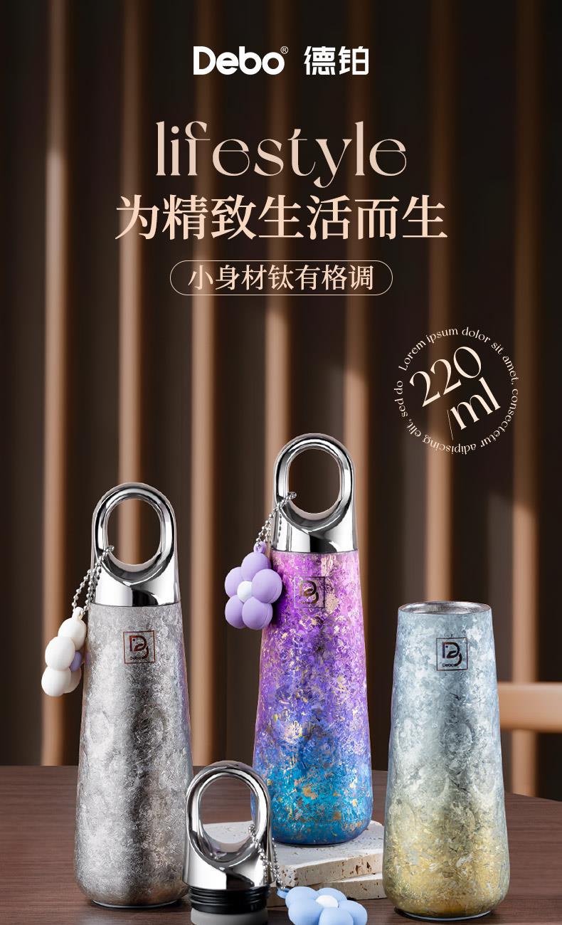 型號:DEP-991 顏色:本色/漸變藍/漸變紫 容量:220ml 材質:鈦 包裝尺寸:143*100*83mm 配置:杯身*1、杯蓋*1、太陽花掛飾*1 1. 小巧精致,出門便攜,輕松收納,瀟灑出街; 2. 水的柔美與力量繪畫成紋,象征著滋養與活力舒適握持盡顯優雅;? 3. 提手如舞者雙臂,提則起舞,體現輕盈,靈動的美感;? 4. 純鈦材質打造,寶石般質感,健康飲水每一天。