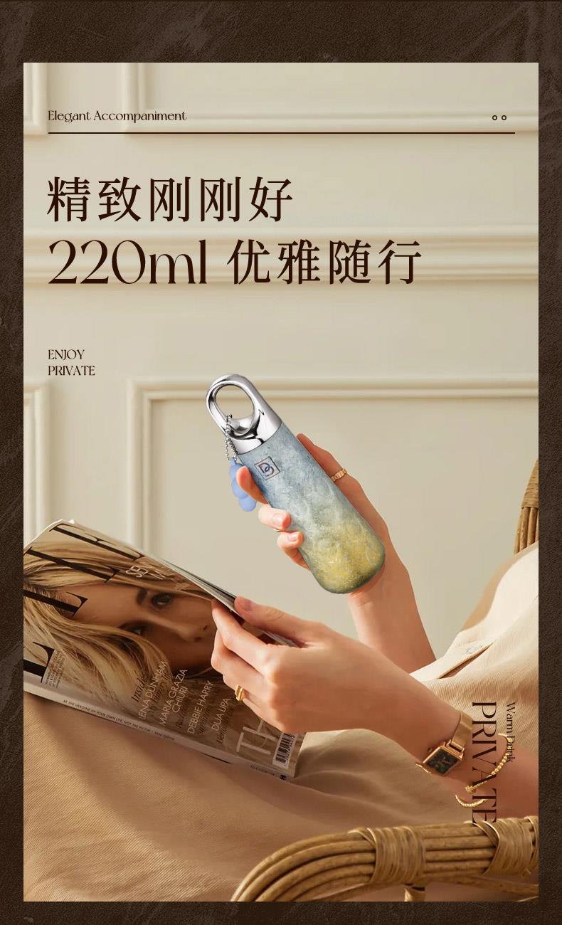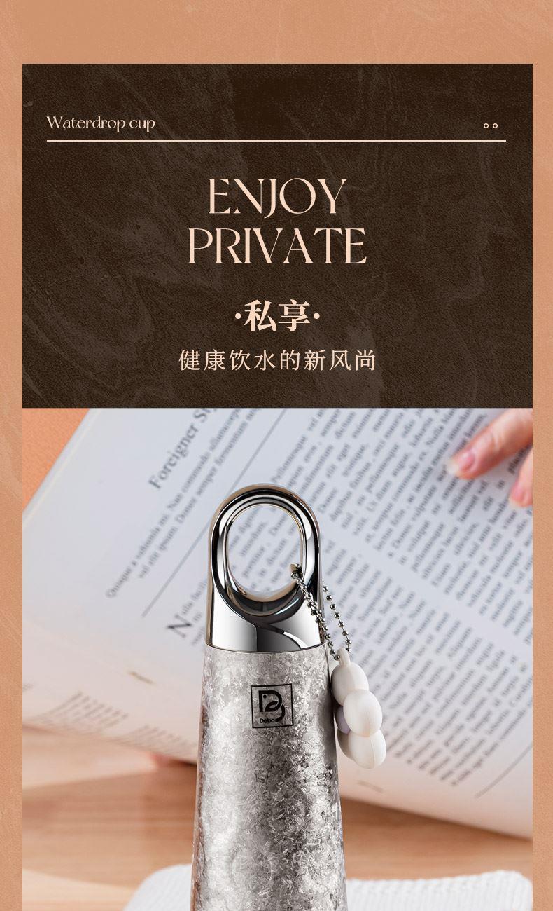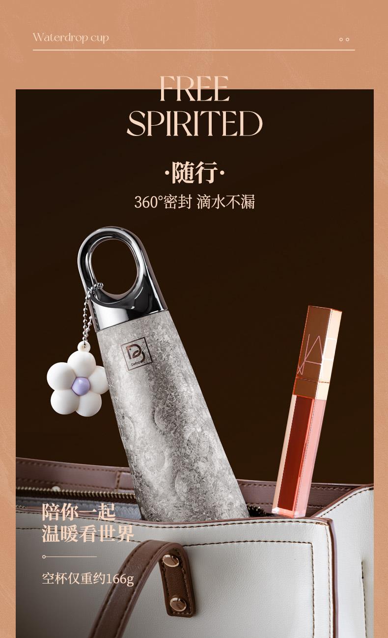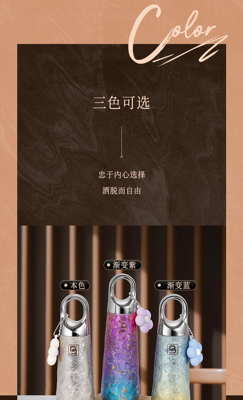 型號:DEP-991 顏色:本色/漸變藍/漸變紫 容量:220ml 材質:鈦 包裝尺寸:143*100*83mm 配置:杯身*1、杯蓋*1、太陽花掛飾*1 1. 小巧精致,出門便攜,輕松收納,瀟灑出街; 2. 水的柔美與力量繪畫成紋,象征著滋養與活力舒適握持盡顯優雅;? 3. 提手如舞者雙臂,提則起舞,體現輕盈,靈動的美感;? 4. 純鈦材質打造,寶石般質感,健康飲水每一天。