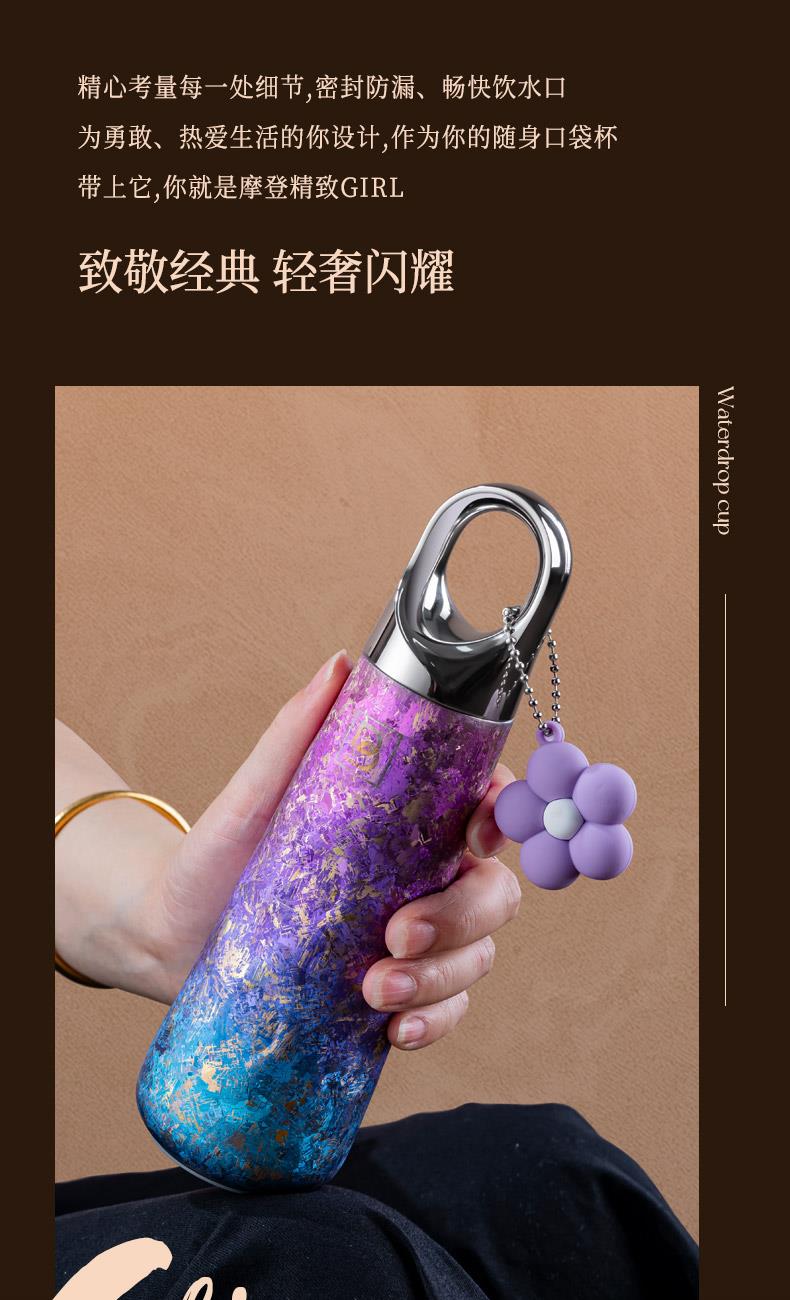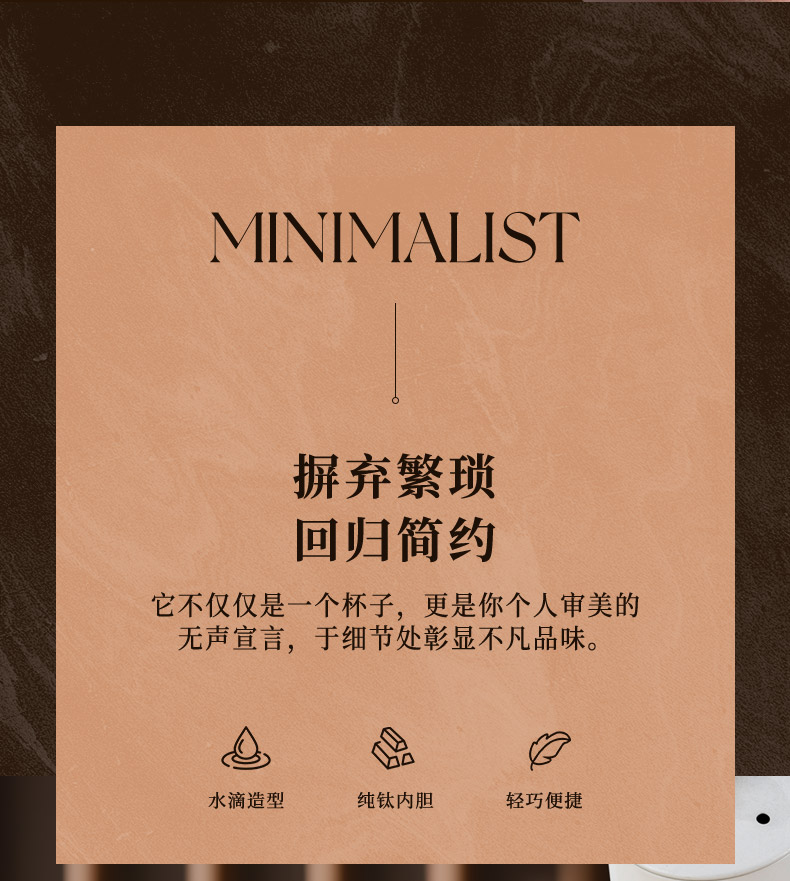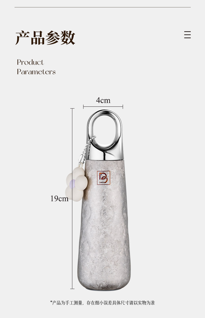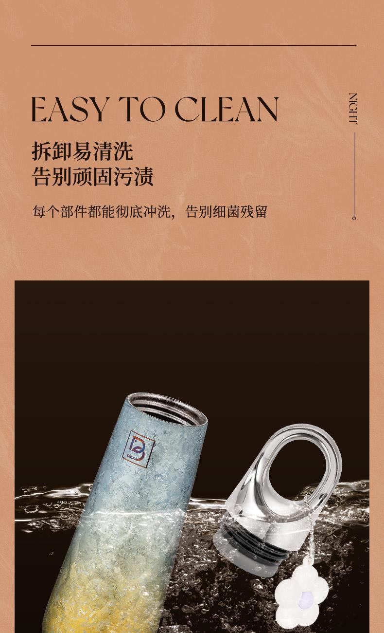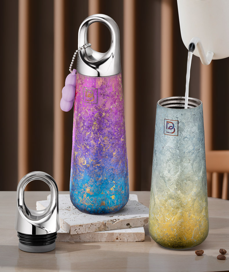型號:DEP-991 顏色:本色/漸變藍/漸變紫 容量:220ml 材質:鈦 包裝尺寸:143*100*83mm 配置:杯身*1、杯蓋*1、太陽花掛飾*1 1. 小巧精致,出門便攜,輕松收納,瀟灑出街; 2. 水的柔美與力量繪畫成紋,象征著滋養與活力舒適握持盡顯優雅;? 3. 提手如舞者雙臂,提則起舞,體現輕盈,靈動的美感;? 4. 純鈦材質打造,寶石般質感,健康飲水每一天。